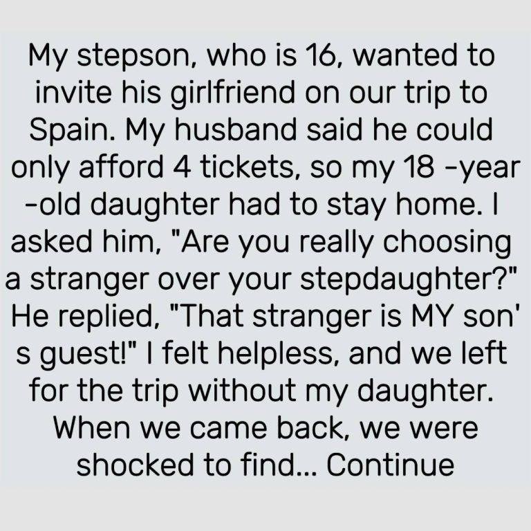 My 16 y.o. stepson wants to invite his new girlfriend on our trip to Spain. My husband agreed but said he can’t afford more than 4 tickets, so we have to leave my 18 y.o. daughter at home. I was furious and blamed him for choosing a stranger over his own stepdaughter whom he’d been raising since she was 7. He replied,