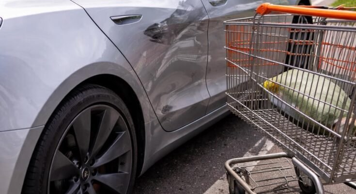 I’m not gonna let this one down. I come out and there’s a cart right next to it. Heart dropped. Massive dent in the side of my door. Not a scratch — a full blown dent. My car is probably gonna be totaled after this over something so little it takes five seconds to prevent.
