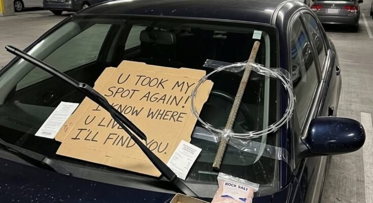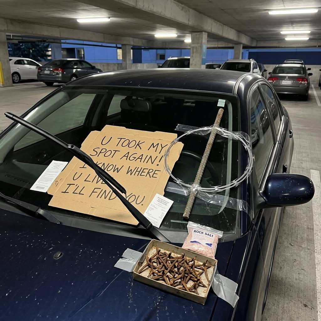 I pay for this parking spot and somehow I’m the one getting threatened over it. Came back and saw all this extra bullshit on my car like they’re trying to prove something instead of just parking where they’re supposed to.