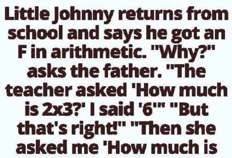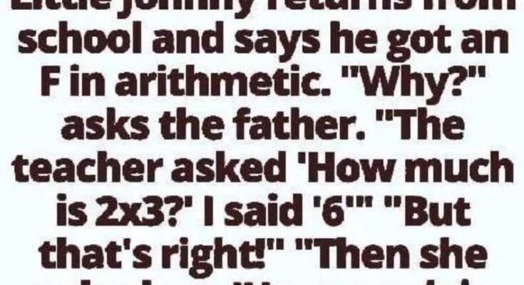 One afternoon, Johnny came home and calmly announced he had received an F in math. His father, alarmed but puzzled by Johnny’s calm, asked what had happened. Johnny recounted the lesson clearly: the teacher asked, “What’s three times two?” and he answered, “Six.” Then, immediately afterward, the teacher asked, “What’s two times three?” To Johnny, this was absurd—six was still six. Logic dictated there was no need to repeat the answer.