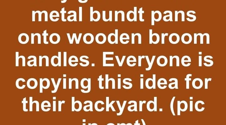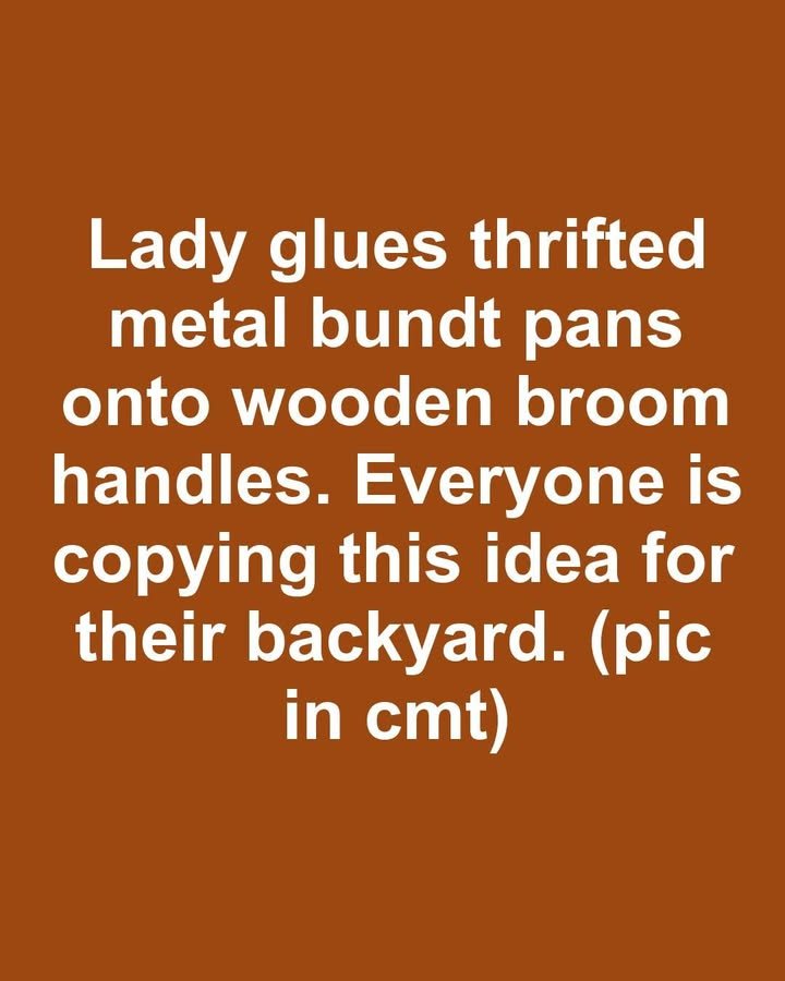 Lady glues thrifted metal bundt pans onto wooden broom handles. Everyone is copying this idea for their backyard.