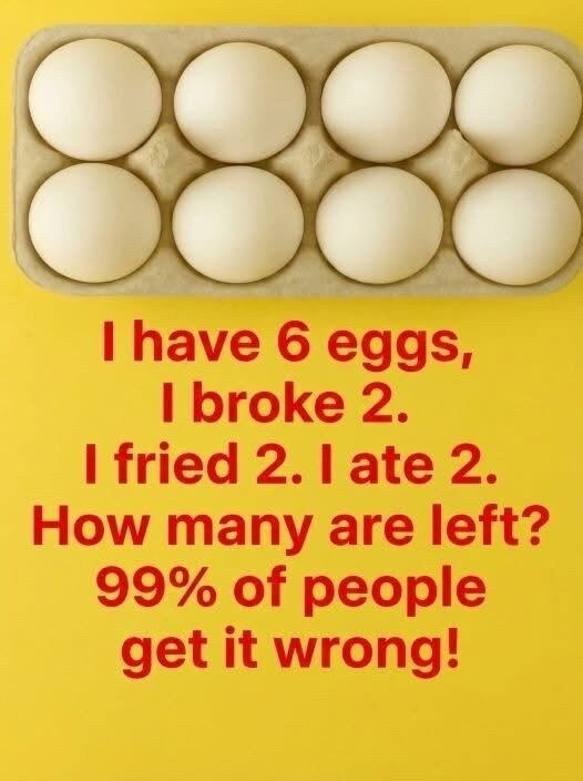 When viewed this way, the answer becomes clear and surprisingly simple. You began with six eggs, used only two throughout the entire process, and left the other four untouched. So, four eggs remain. This riddle is a lighthearted reminder that effective problem-solving often depends on patience and attention to wording. By slowing down and thinking through each step, we can avoid common mental shortcuts and arrive at clearer, more accurate conclusions—both in puzzles and in everyday life.