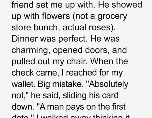 He arrived early. Brought roses. Held the door. Even gifted me a small engraved keychain with my initial. Over dinner he asked real questions, listened, and seemed genuinely invested. I actually left thinking Mia might’ve been right — maybe decent men weren’t extinct after all.