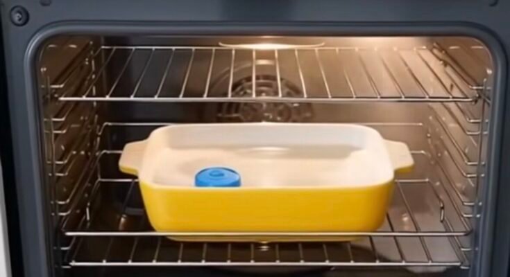 Cleaning an oven is often a dreaded chore, but Nana’s no-fuss trick makes it surprisingly easy. Instead of harsh chemicals and hours of scrubbing, you only need three items: a dishwashing pod, a heatproof casserole dish, and water. Start by preheating your oven to 200°F (93°C). Fill the dish with water and drop in the dishwashing pod.